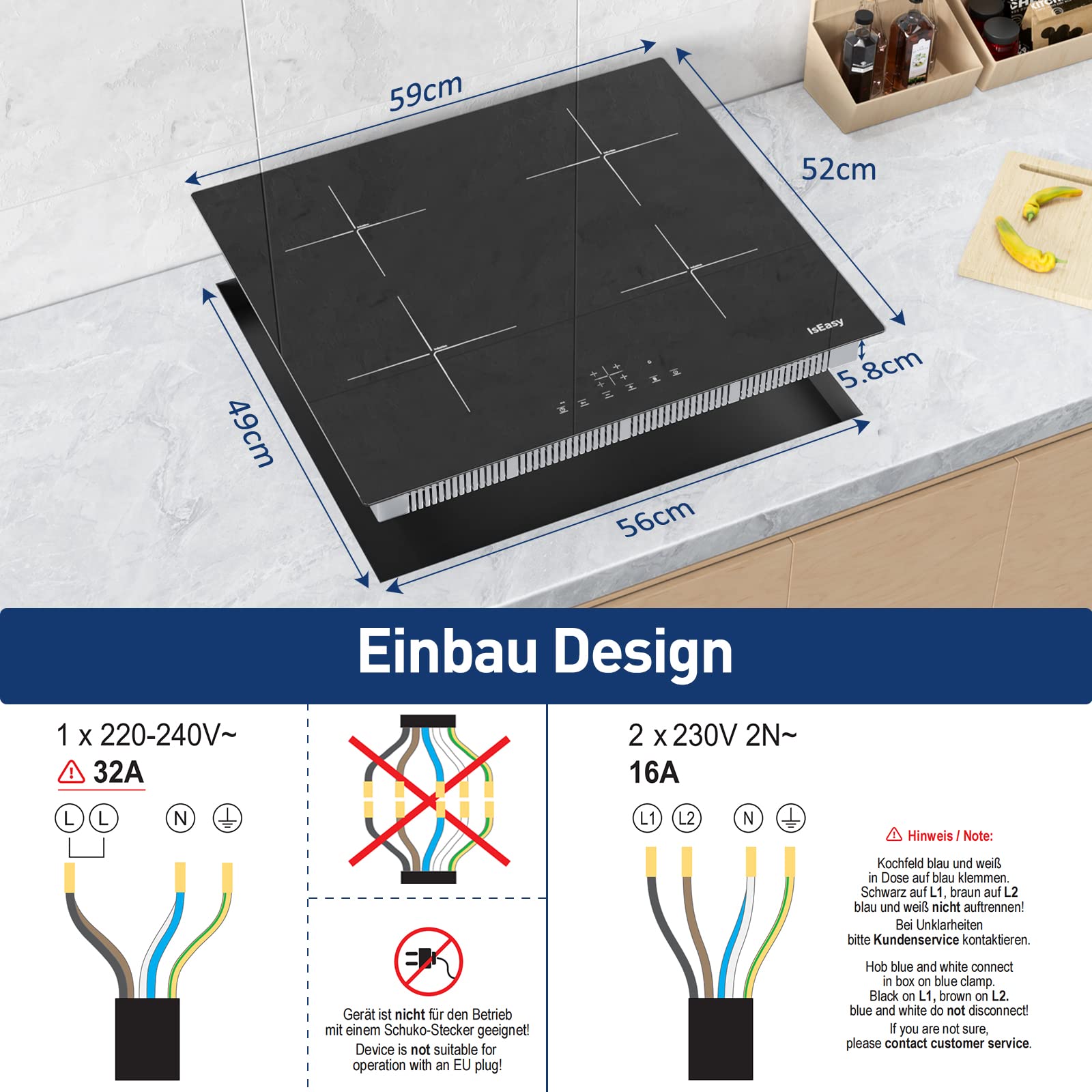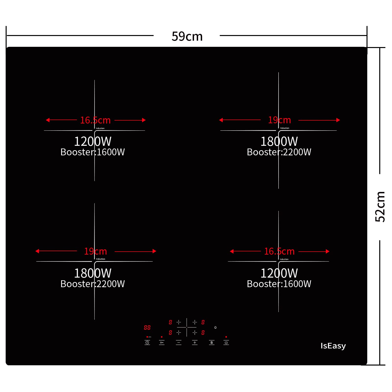 IsEasy 4 Zonen Einbau Induktionskochfeld mit 9 Leistungsstufen &1-99Min Timer, Boost-Funktion, Induktionskochplatte, Induktion Herdplatte mit 4 Platten, 60cm, 6800W, Schwarz